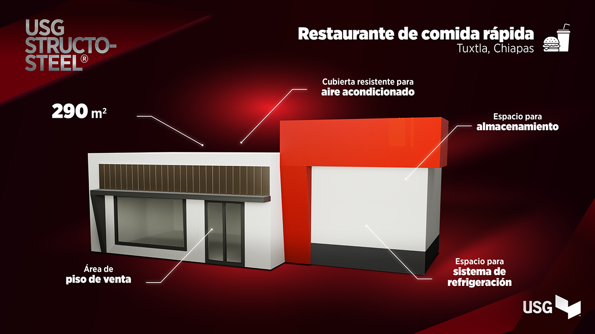 El sistema USG STRUCTO STEEL® es desplantado sobre una losa de cimentación de concreto, la construcción consta de 1 nivel, utilizando acero galvanizado estructural calibre 18 grado 50, basado en los planos arquitectonicos e ingenierias desarrolladas bajo la tecnología de USG. Esta obra fue construida en 3 semanas y se requirieron 8 personas para su construcción.